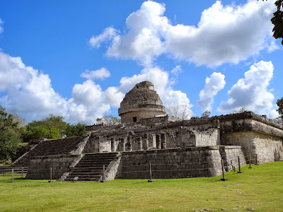Jour 16, mardi, nous sommes alles visiter le site archeologique de Chitchen Itza. Qualifie de site Maya, il aurait plutot ete construit par les Itzaes, d-ou son nom. Nous etions toujours avec la meme agence qui assure un max. Le guide David etait top. Sur ce site, on escalade rien, car il y a eu un accident par le passe, donc depuis on regarde du sol uniquement. Belle pyramide dediee a Kulkulkan(l-equivalent de Quetzalcoatl a Teotihuacan : le serpent a plumes). C-est un des plus grands dieux que veneraient les peuples. Parmi eux egalement le dieu de la pluie, du mais, du soleil, de la lune, de l-inframonde... Sur cette pyramide, a chaque solstice, on peut observer un jeu de lumiere incroyable : le soleil fait a pparaitre un serpent qui se dessine sur la tranche de la pyramide comme s-il partait du haut pour descendre rejoindre l-inframonde. Joli site, et joli terrain de pelote immense. On y voit aussi un enorme cenote de 60m de diametre, qui etait a l-epoque le puit des sacrifices.